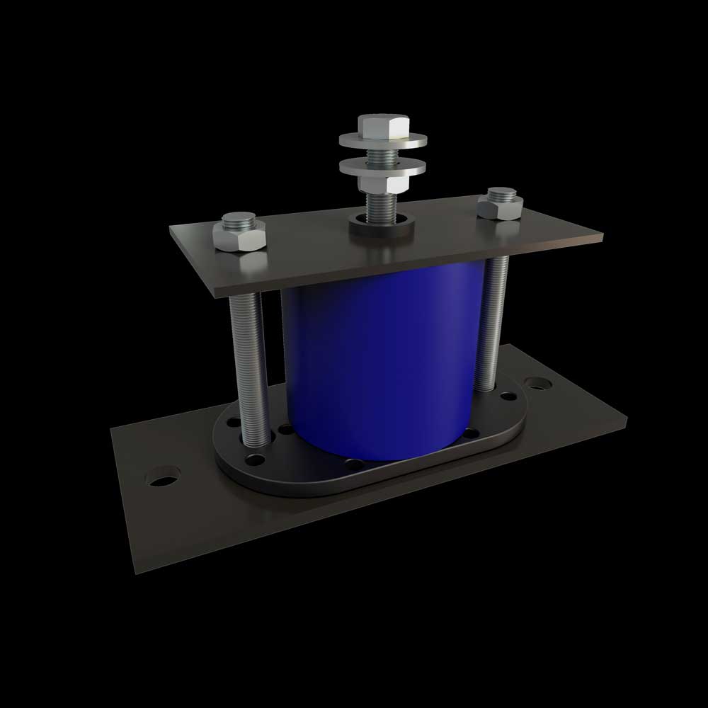 Kinetics RD/RDS vibration isolators are one-piece moulded neoprene mounts with encapsulated metal inserts, are colour coded to identify capacity, and have non-skid ribs on the bottom load surfaces. Each isolator incorporates two bolt-down holes on the bottom load surface and a tapped steel load top plate for attachment to the supported equipment. The neoprene is highly oil resistant and has been designed to operate within the strain limits of the isolator to provide maximum isolation and longest life expectancy possible using neoprene compounds.