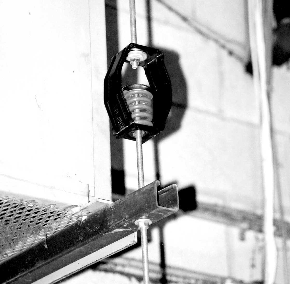 To assure stability, the spring element has a minimum lateral spring stiffness of 1.0 times the rated vertical stiffness. Hangers with properly deflected coils will allow a support rod misalignment through a 30° arc without short circuiting. Isolation brackets will carry a 500% overload without failure.